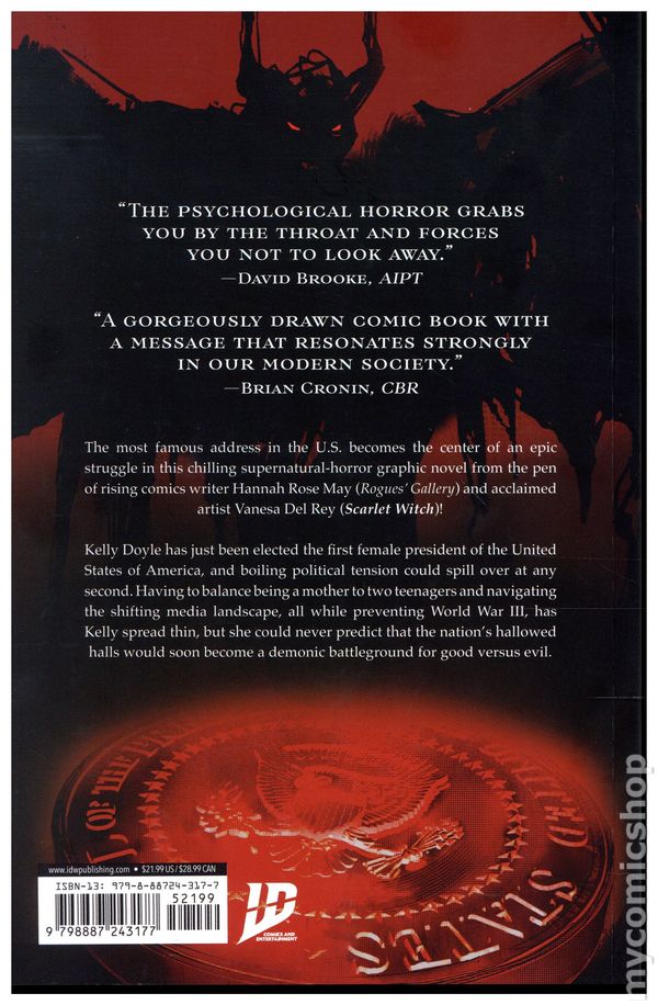 1st printing. Collects Exorcism at 1600 Penn (2024 IDW) #1-4. Written by Hannah Rose May. Art and cover by Vanesa Del Rey. The most famous address in the U.S. becomes the center of an epic struggle in this chilling supernatural-horror graphic novel! Kelly Doyle has just been elected the first female president of the United States of America, and boiling political tension could spill over at any second. Having to balance being a mother to two teenagers and navigating the shifting media landscape, all while preventing World War III, has Kelly spread thin, but she could never predict that the nation's hallowed halls would soon become a demonic battleground for good versus evil. Softcover, 128 pages, full color. Mature Readers Cover price $21.99.