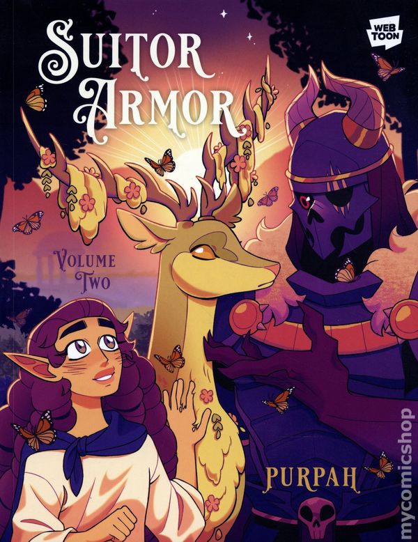 Volume 1 - 1st printing. Story and art by Purpah. Secrets hide behind every corner of the castle walls in the first volume of an exciting Webtoon romantasy graphic novel that follows the budding romance between a lady-in-waiting and an enchanted suit of armor. While humans and fairies are at war beyond the castle walls, Lucias life is dedicated to helping prepare Lady Kirsi for her upcoming wedding to King Reimund. Lucias time at court takes a dazzling turn when she accompanies Lady Kirsi to a royal tournament that calls together all of the kingdom's brave knights for a competition of strength and wit. A magically animated suit of armor, brought to life by Norrix the court mage's complicated enchantment spell, enters the ring and challenges the winning knight. Lucia is immediately attracted to the armor's dark, mysterious charm and lovingly names him Modeus. Bonded by their mutual status as outcasts within the kingdom, the two begin to develop an unlikely yet thrilling connection and sparks (both metaphorical and magical) fly. The truth is, Lucia is hiding a dangerous secret about her own identity. She is the enemy: a fairy. She fears being exposed to the whole human kingdom, but she desperately desires to learn more about herself--especially with the arrival of a winged visitor who has infiltrated the castle walls for reasons still unknown... Complete with original behind-the-scenes content and a bonus storyline exclusive to the book, this first volume includes episodes 1-17 of the greatly successful Webtoon webcomic Suitor Armor and sets the stage for a grand adventure in magic, romance, mystery, fantasy creatures, friendship, self-discovery, and more! Softcover, 7 1/2-in. x 9 1/2-in., 224 pages, full color. Cover price $17.99.