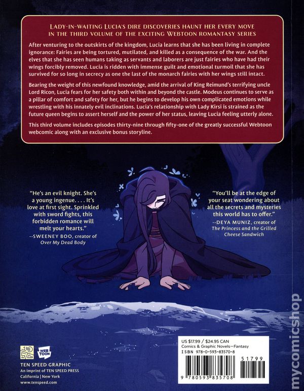 Volume 3 - 1st printing. Story and art by Purpah. After paying a visit to an illegal market on the outskirts of the kingdom, per direction from her imprisoned faerie ally Quinn, Lucia learns that she has been living in complete ignorance: Fairies are being tortured, mutilated, and killed as a consequence of the war. And the elves that she has seen humans taking as servants and laborers are just faeries who have had their wings forcibly removed. Lucia is ridden with immense guilt and emotional turmoil that she has survived for so long in secrecy as one the last of the monarch faeries with her wings still intact. Complete with original behind-the-scenes content and a bonus storyline exclusive to the book, this thrilling and suspenseful third volume includes episodes 39-51 of the greatly successful Webtoon webcomic. Softcover, 7 1/2-in. x 9 1/2-in., 224 pages, full color. Cover price $17.99.