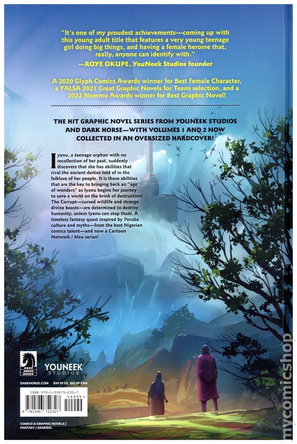 Volume 1 - 1st printing. Collects Iyanu Child of Wonder TPB (2021- Dark Horse) Vol. 1-2. Written by Roye Okupe. Art and cover by Godwin Akpan. Now a Cartoon Network/Max Animated Series! The hit graphic novel series from YouNeek Studios and Dark Horse-with Volumes 1 and 2 now collected in an oversized volume! Iyanu, a teenage orphan with no recollection of her past, suddenly discovers that she has abilities that rival the ancient deities told of in the folklore of her people. It is these abilities that are the key to bringing back an "age of wonders," as Iyanu begins her journey to save a world on the brink of destruction! The Corrupt-cursed wildlife and strange, divine beasts-are determined to destroy humanity, unless Iyanu can stop them. A timeless fantasy quest inspired by Yoruba culture and myths-from the best Nigerian comics talent! Hardcover, 8-in. x 11-in., 256 pages, full color. Cover price $49.99.