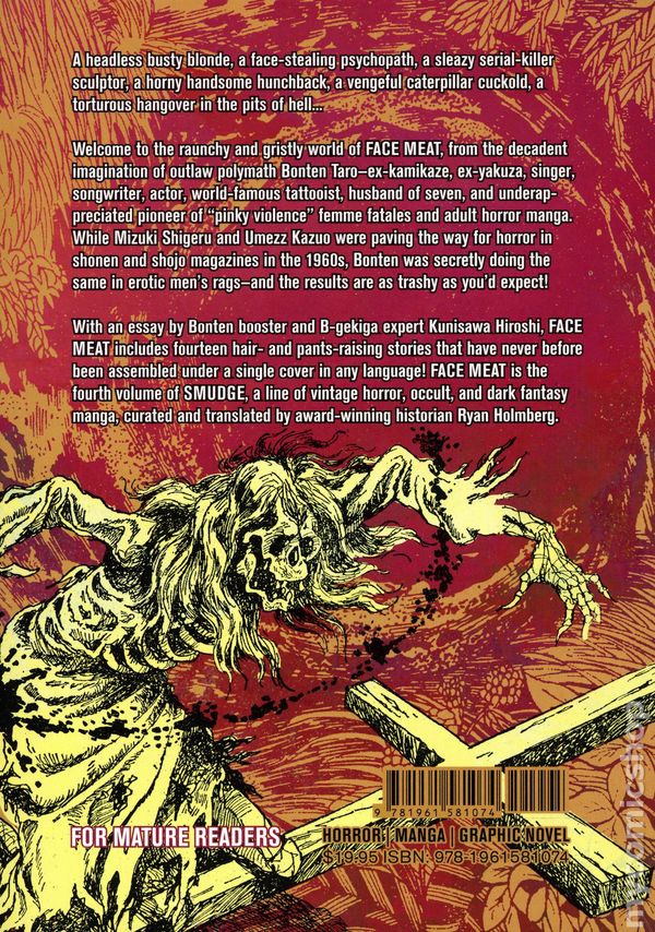 1st printing. Story and art by Bonten Taro. A headless busty blonde, a face-stealing psychopath, a sleazy serial-killer sculptor, a horny handsome hunchback, a vengeful caterpillar cuckold, a torturous hangover in the pits of hell. Welcome to the raunchy and gristly world of FACE MEAT, from the decadent imagination of outlaw polymath Bonten Taro-ex-kamikaze, ex-yakuza, singer, songwriter, actor, world-famous tattooist, husband of seven, and underappreciated pioneer of "pinky violence" femme fatales and adult horror manga. While Mizuki Shigeru and Umezz Kazuo were paving the way for horror in shonen and shojo magazines in the 1960s, Bonten was secretly doing the same in erotic men's rags-and the results are as trashy as you'd expect. With an essay by Bonten booster and B-gekiga expert Kunisawa Hiroshi, Face Meat includes fourteen hair- and pants-raising stories that have never before been assembled under a single cover in any language! Softcover, 6-in.x 8 1/2-in., 324 pages, PC/PB&W. Mature Readers Cover price $19.95.