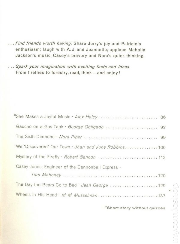 Part 1 of 5th grade reading level - 1967. Stories and articles adapted from Reader's Digest. The amount of horses on the front is equal to the reading level of the book. The first number in the issue is the reading level and the second number is the part number. 5.25" x 7", 144 pages, partial color.