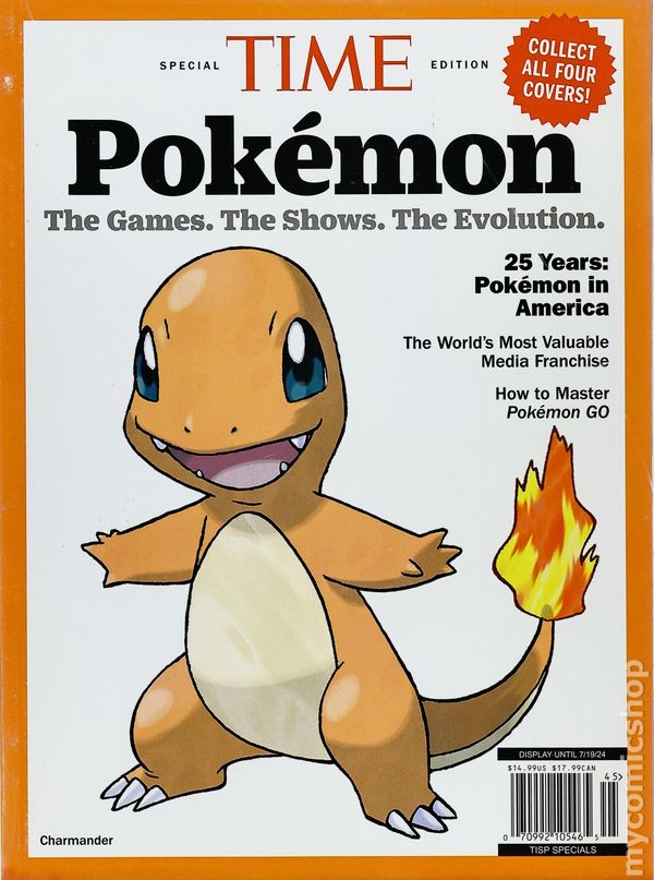 "Charmander" Edition Variant Cover. A Time Special Edition following Pokemon's 25 successful years in the U.S., covering the video games, TV show, and evolution of the brand. Includes articles over "The World's Most Valuable Media Franchise" and "How to Master Pokemon GO". 8" X 10 3/4". Cover price $14.99.
