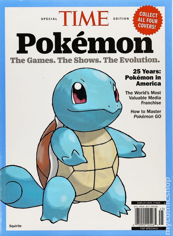 "Squirtle" Edition Variant Cover. A Time Special Edition following Pokemon's 25 successful years in the U.S., covering the video games, TV show, and evolution of the brand. Includes articles over "The World's Most Valuable Media Franchise" and "How to Master Pokemon GO". 8" X 10 3/4". Cover price $14.99.