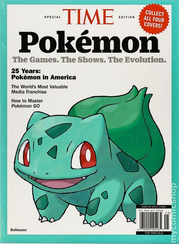 "Bulbasaur" Edition Variant Cover. A Time Special Edition Following Pokemon's 25 successful years in the U.S., covering the video games, TV show, and evolution of the brand. Includes articles over "The World's Most Valuable Media Franchise" and "How to Master Pokemon GO". 8" X 10 3/4". Cover price $14.99.