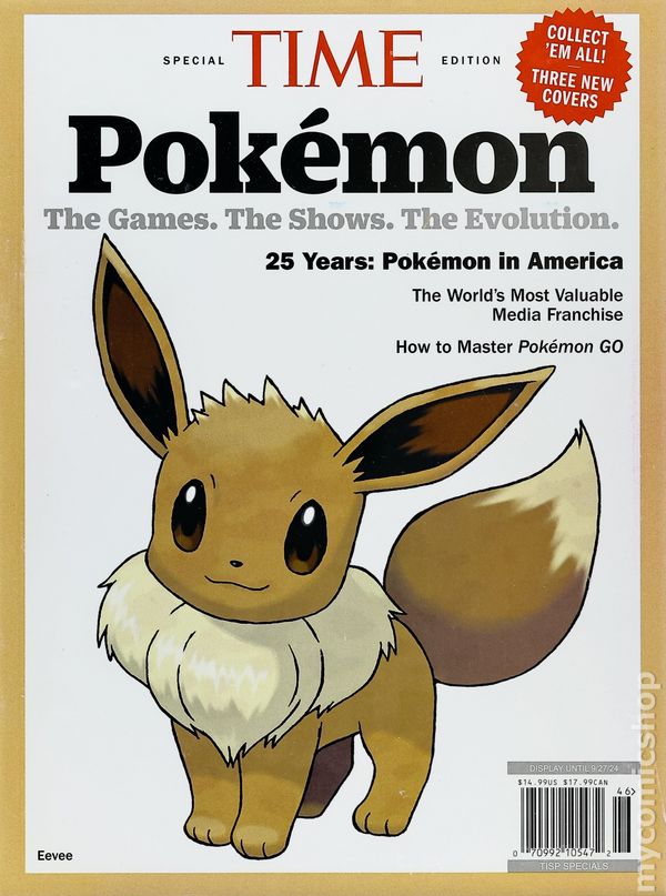"Eevee" Edition Variant Cover. A Time Special Edition following Pokemon's 25 successful years in the U.S., covering the video games, TV show, and evolution of the brand. Includes articles over "The World's Most Valuable Media Franchise" and "How to Master Pokemon GO". 8" X 10 3/4". Cover price $14.99.