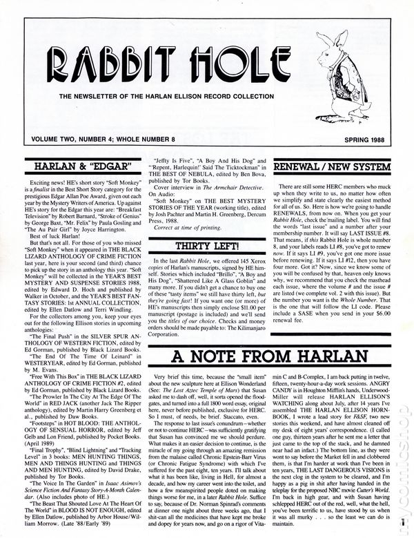 View scansVol. 2, No. 4 - Whole Number 8. Spring 1988. Newsletter of The Harlan Ellison Record Collection. Originally created as a means to promote Harlan's audio recordings to his fans, it also gave him the opportunity to sell books from his back list, offer updates on projects, the occasional essay, scheduled appearances, publication schedules, and Harlan's ever present opinions on...everything. Is there consistency through the issues? Only in that they offer a relaxed review of All Things Ellison. 8.5" x 11", 4 pages, B&W Cover price $1.75.