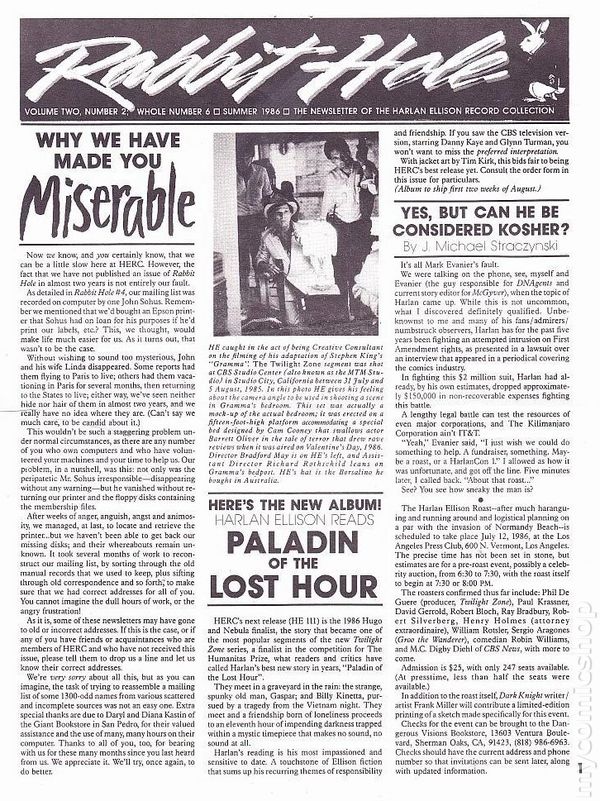 Vol. 2, No. 2 - Whole Number 6. Summer 1986. Newsletter of The Harlan Ellison Record Collection. Originally created as a means to promote Harlan's audio recordings to his fans, it also gave him the opportunity to sell books from his back list, offer updates on projects, the occasional essay, scheduled appearances, publication schedules, and Harlan's ever present opinions on...everything. Is there consistency through the issues? Only in that they offer a relaxed review of All Things Ellison. 8.5" x 11", 4 pages, B&W