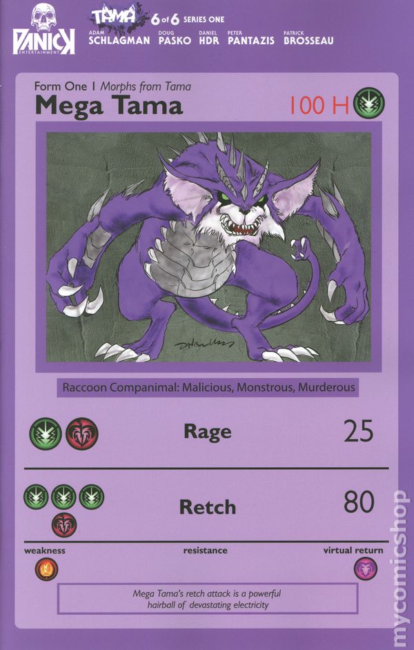 (W) Adam Schlagman, Doug Pasko (A) Daniel HDR (CA) Daniel HDR Panick Entertainment Presents: T.A.M.A. #4. The virtual pet that wants to Kill Em All! The hottest new original book of the year continues as its become crystal clear that TAMAs a murderous beast. As TAMAs victims become more personal to Kit, can the grieving teen bring himself to turn off his furry fearsome friend? And what atrocious tragedy will occur this issue to someone dear to him? Cover B by Daniel HDR, featuring a look at TAMA's Companimal friends in an homage to Pokemon. 32 pages, full color, not rated. Cover price $4.99.