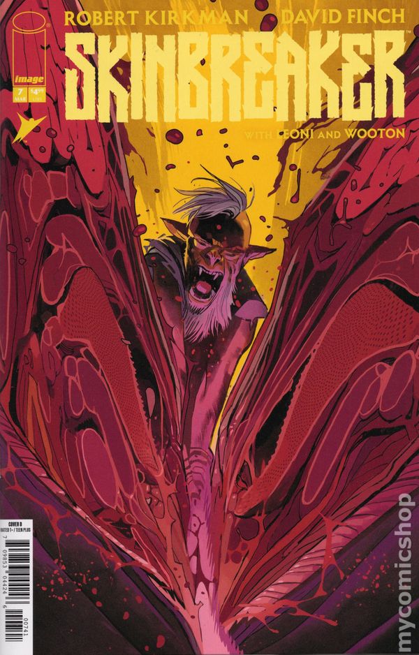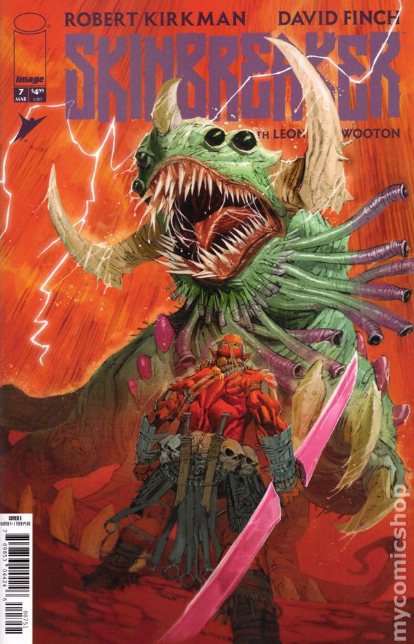Written by Robert Kirkman. Art by David Finch, Annalisa Leoni. Cover by David Finch. SERIES PREMIERE FOR FANS OF INVINCIBLE UNIVERSE: BATTLE BEAST COMES YOUR NEW FAVORITE SERIES! ** The dream team of ROBERT KIRKMAN** (THE WALKING DEAD_, _INVINCIBLE) and superstar artist DAVID FINCH (Batman, New Avengers) present a visionary action epic unlike anything youve ever seen. Enor has led his tribe for many seasons, but his time as Chieftan is coming to an end. He wields the mighty SKINBREAKER, but at his age, he can barely lift it. Will Enors reluctant heir, Anok, take over before their world falls to ruin? As a bloody power struggle begins, an even bigger threat lurks in the darkness beyond their village. SKINBREAKER tells the story of a people on the verge of collapse and their fight for survival as the many threats they face close in for the kill. 32 pages, full color. Rated T+ Cover price $4.99.