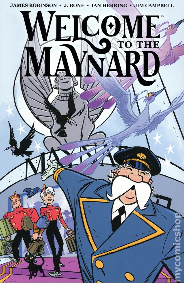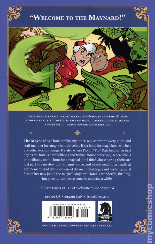 1st printing. Collects Welcome to the Maynard (2024 Dark Horse) #1-4. Written by James Robinson. Art and cover by J. Bone. Welcome to the Maynard! A grand hotel full of luxury and style... but where the guests are all wizards, witches and mythical creatures! Join Philippa (Pip) Dale as she begins her new job as a bellhop (and trainee house detective) at the exclusive Maynard Hotel for Wizards (and folks of a magical ilk). This opulent, amazing hotel exists right under the noses of everyday San Francisco, where real magicians, witches, mystical characters and fantastic creatures all come to stay. However, Pip's working days aren't merely full of amazing sights and magical experiences, they come with thrills and dangers too. She must try to catch a magical hotel thief, although their strange choice of thefts suggests that murder is the ultimate goal. Can Pip solve the mystery of who the thief's target is in time to save the intended victim? Softcover, 120 pages, full color. Cover price $19.99.