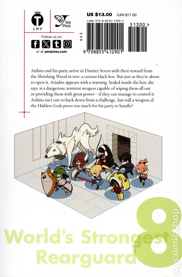 Volume 8 - 1st printing. Written by Tôwa. Art and cover by Rikizo. Character Design by Huuka Kazabana. Translated by Jordan Taylor. Arihito and his party have finally made it to District Seven! In order to give their combat prowess a boost, they decide to open the Black Box they received in the battle with the Vine Puppeteer. But according to Ariadne, a dangerous, sentient weapon-an armament-is sealed within... Softcover, 5-in. x 7-in., 160 pages, B&W. Teen Cover price $13.00.