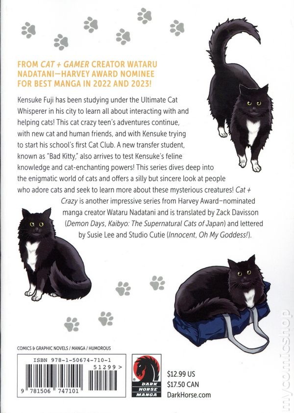 Volume 3 - 1st printing. Story and art by Wataru Nadatani. Translated by Zack Davisson. From Wataru Nadatani, the creator of Cat + Gamer, comes Cat + Crazy, a humorous cat manga for all animal and cat lovers! The journey to become a cat whisperer is long, but its full of feline fun! High schooler Kensuke Fuji loves cats, but cant have any of his own. Recently, he's made the acquaintance of a local cat whisperer, Nekoya Jin, who seems to know everything about the feline realm! Kensuke has become his disciple, studying under this Ultimate Cat Whisperer to learn all about cats. Their adventures continue, with Kensuke and readers delving deeper into the enigmatic world of cats and the humans who wind up obsessed with them! A silly but sincere look at people who adore cats—and seek to learn more about these mysterious creatures, Cat + Crazy is another impressive series from Harvey Award nominated manga creator Wataru Nadatani (Cat + Gamer, Best Series)—and is translated by Zack Davisson (Demon Days, Kaibyo: The Supernatural Cats of Japan) and lettered by Susie Lee of Studio Cutie (Innocent, Oh My Goddess!). Softcover, 5-in.x 7-in., 184 pages, full color. All Ages Cover price $12.99.