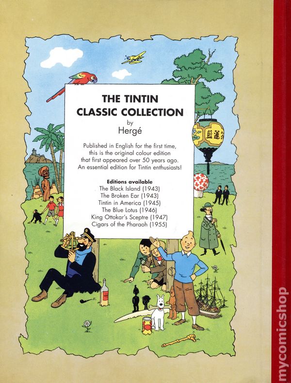 1st Printing. Story and art by Herge. Picking up where he left off in the Egyptian adventure "Cigars of the Pharaoh," Tintin travels to China in "The Blue Lotus," a tale which is generally considered Herge's first masterpiece. It's also Tintin's only foray into actual history, specifically the Sino-Japanese conflicts of the early 1930s. The political tensions combined with the chilling threats of drugs give the story an especially high and realistic sense of danger. Herge paints a vivid picture of China and takes the opportunity to denounce ethnic prejudices (though ironically his artistic depiction of the Japanese businessman Mitsuhirato is quite grotesque). Hardcover, 9 1/2-in. x 12-in., 62 pages, full color.