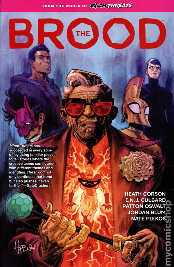 1st printing. Collects From the World of Minor Threats: The Brood (2024 Dark Horse) #1-4. Written by Heath Corson, Patton Oswalt, and Jordan Blum. Art by I.N.J. Culbard. Cover by Scott Hepburn and Ian Herring. Back Cover by I.N.J. Culbard. From the world of the hit Minor Threats series comes a family drama starring the planet's most feared villains. Napoleon Archimedes is the archnemesis of The Searcher, and he's fought her to a standstill for over four decades in the futuristic metropolis of Meteor Falls. But now, as he confronts his mortality, he's forced to name a successor from his three extraordinary children: Athena, Benjamin, and Spookshow. Each brilliant, cunning... and unlucky enough to be the child of the world's greatest supervillain. See, Napoleon believed he was smart enough to have it all: Raise a family and conquer the world. Then he thought: Why not combine them? Take the kids on as partners. Create a dynasty... None of it went according to plan. Who will rise above the betrayal, failure, and dysfunction to seize the family business? Softcover, 120 pages, full color. Cover price $19.99.