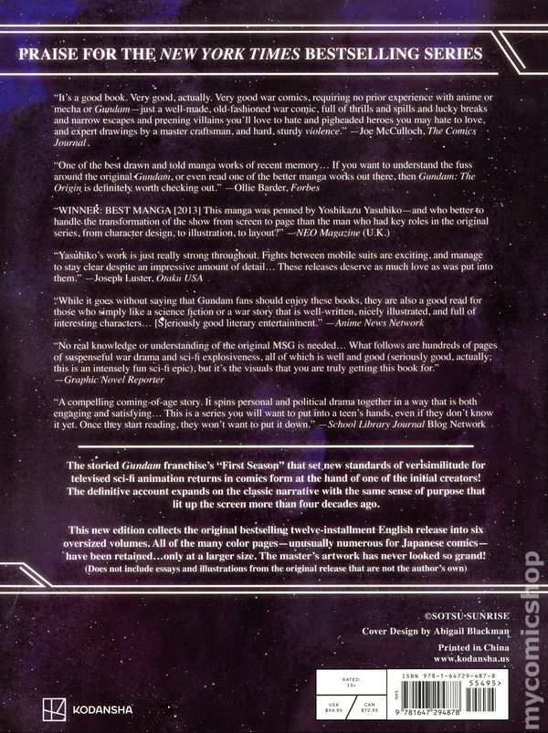 Volume 2 - 1st printing. Original Story by Yoshiyuki Tomino and Hajime Yatate. Mechanical Design by Kunio Okawara. The classic Gundam series now in a premium Deluxe Edition hardcover! PRAISE FOR THE NEW YORK TIMES BESTSELLING SERIES: Its a good book. Very good, actually. Very good war comics, requiring no prior experience with anime or mecha or Gundam—just a well-made, old-fashioned war comic, full of thrills and spills and lucky breaks and narrow escapes and preening villains youll love to hate and pigheaded heroes you may hate to love, and expert drawings by a master craftsman, and hard, sturdy violence. —Joe McCulloch, The Comics Journal One of the best drawn and told manga works of recent memory… If you want to understand the fuss around the original Gundam, or even read one of the better manga works out there, then Gundam: The Origin is definitely worth checking out. —Ollie Barder, Forbes WINNER: BEST MANGA [2013] This manga was penned by Yoshikazu Yasuhiko—and who better to handle the transformation of the show from screen to page than the man who had key roles in the original series, from character design, to illustration, to layout? —NEO Magazine (U.K.) Yasuhikos work is just really strong throughout. Fights between mobile suits are exciting, and manage to stay clear despite an impressive amount of detail… These releases deserve as much love as was put into them.—Joseph Luster, Otaku USA While it goes without saying that Gundam fans should enjoy these books, they are also a good read for those who simply like a science fiction or a war story that is well-written, nicely illustrated, and full of interesting characters… [S]eriously good literary entertainment. —Anime News Network No real knowledge or understanding of the original MSG is needed… What follows are hundreds of pages of suspenseful war drama and sci-fi explosiveness, all of which is well and good (seriously good, actually; this is an intensely fun sci-fi epic), but its the visuals that you are truly getting this book for. —Graphic Novel Reporter A compelling coming-of-age story. It spins personal and political drama together in a way that is both engaging and satisfying… This is a series you will want to put into a teens hands, even if they dont know it yet. Once they start reading, they wont want to put it down. —School Library Journal Blog Network The storied Gundam franchises First Season that set new standards of verisimilitude for televised sci-fi animation returns in comics form at the hand of one of the initial creators! The definitive account expands on the classic narrative with the same sense of purpose that lit up the screen more than four decades ago. This new edition collects the original bestselling twelve-installment English release into six oversized volumes. All of the many color pages—unusually numerous for Japanese comics—have been retained…only at a larger size. The masters artwork has never looked so grand! Hardcover, 7 3/4-in. x 10 1/4-in., 976 pages, B&W. NOTE: Does not include essays and illustrations from the original release that are not the authors own. Cover price $54.95.