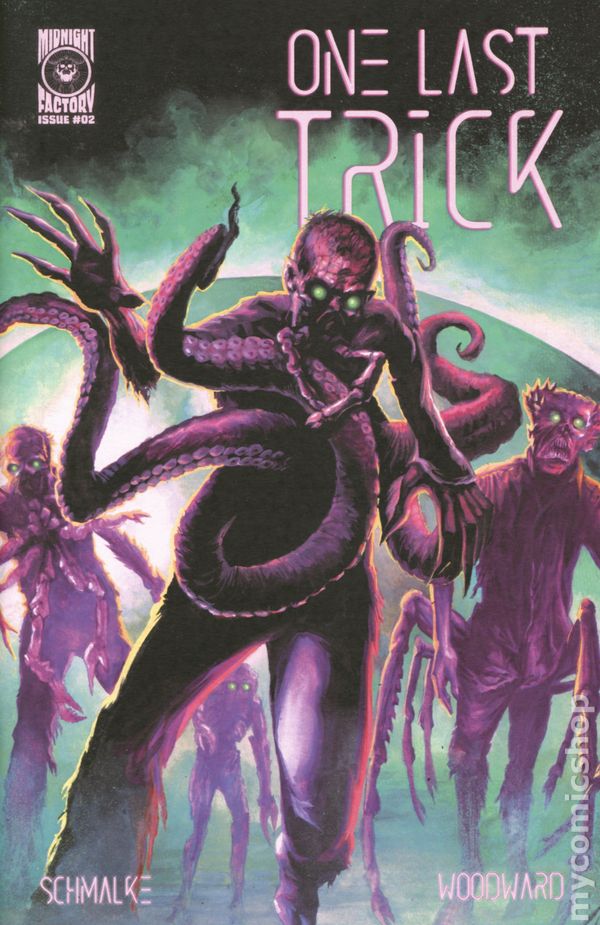 (W) Joseph Schmalke (A) J.K. Woodward (CA) Joseph Schmalke Midnight Factory Presents: One Last Trick. Julie Bennings is a cybernetic escort. Indebted to the Chambers Corporation for their life saving augments, she has one last job and then her debt is paid. But everyone knows the Chambers Corporation never lets anyone go. Julie soon will discover the truth about the company that dominates mankind. A cyberpunk noir story with eldritch horror, written and created by Joseph Schmalke (We Dont Kill Spiders, the Electric Black, and Seven Years in Darkness) with stunning artwork by co-creator J.K. Woodward (Star Trek, X-Men Origins, and Heavy Metal). 24 pages, full color, not rated. Cover price $4.99.