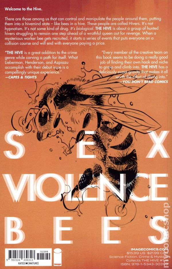 1st printing. Collects The Hive (2025 Image) #1-4. Written by A. J. Lieberman. Art and Cover by Mike Henderson. There are those among us that can connect and manipulate the people around them into a hivemind state—like a beehive. These people are called Hivers. It's not hypnotism. It's not some kind of drug. It's biological. Sex. Violence. And Bees. Welcome to The Hive. Softcover, 112 pages, full color. Mature Readers Cover price $15.99.
