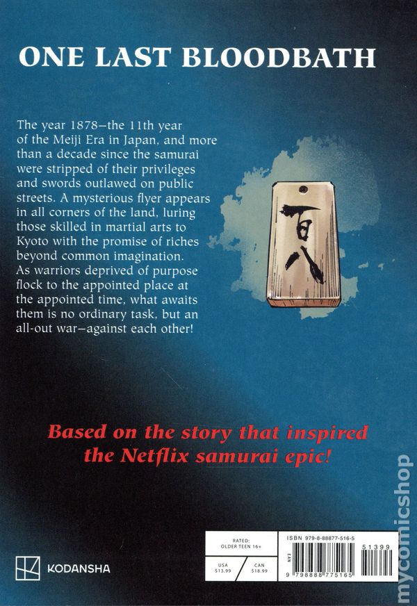 Volume 3 - 1st printing. Based on the Novel Series by Shogo Imamura. Art and cover by TATSUZ. Translated by Matt Treyvaud. Based on the story that inspired the Netflix samurai epic! As the 19th century comes to a bloody end, a sinister game of life-or-death brutally culls Japans fading warrior class. Who is rounding up the few who still cling to their swords and forcing them to fight? Who will be the last samurai standing? The year 1878--the 11th year of the Meiji era in Japan, and more than a decade since the samurai were stripped of their privileges and swords outlawed on public streets. A mysterious flyer appears in all corners of the land, luring those skilled in martial arts to Kyoto with the promise of riches beyond common imagination. As warriors deprived of purpose flock to the appointed place at the appointed time, what awaits them is no ordinary task, but an all-out war--against each other! Softcover, 5-in. x 7-in., 192 pages, B&W. Older Teen 16+ Cover price $13.99.