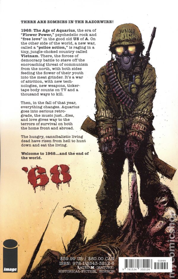 1st printing. Collects 68 (2007 Image 1-shot), 68 (2011 Image Series) #1-4, 68 Scars (2012 Image) #1-4, 68 Hardship (2011 Image) #0, 68 Jungle Jim (2011 Image) #0-4, 68: Rule of War (2014) #1-4, 68: Hallowed Ground (2013 Image), 68: Homefront (2014) #1-4, 68: Last Rites (2015 Image) #1-4, and 68: Jungle Jim - Guts n Glory (2015). Written by Mark Kidwell. Art by Nat Jones, Tim Vigil, Jay Fotos, Jeff Zornow, Nate Van Dyke, Josh Medors, and Kyle Charles. Cover by Nat Jones and Jay Fotos. Foreword by Mark Kidwell. The zombies are back in the razorwire, as Meatgrinder Studios and Image Comics present the official 68 Compendium Edition. This massive tombstone of a volume presents 752 pages of Vietnam zombie mayhem, collecting the full 30 issue comics run of the groundbreaking horror series! On February 13, 1968, during the darkest days of the Vietnam conflict, the gates of hell opened wide, unleashing new and hungry life into the countless war-torn dead. From the original 68 one-shot, to the first four-issue mini-series, the introduction and first appearance of the legendary "Jungle Jim" and beyond, this is the absolute 68 collection, offering up every red, dripping bit! The full series, the one-shots and the short backup stories are all here, in full, jaw-snapping, flesh-rending full color! Get small in your foxhole and keep your powder dry! The hungry undead have risen in the Age of Aquarius…and theres not enough Napalm in the world! Softcover, 752 pages, full color. Mature Readers Cover price $59.99.