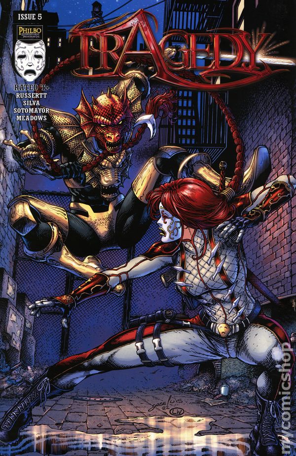 Written by Phillip Russertt. Art by Ricardo Silva. Cover by David Mack Who is the Breath of the Dragon and where did he get is special abilities? What secrets are being kept by Jesse Juan? You will get answers as issue four gets into the past of the dragon and does he somehow share a past with Grace? Find out in another action packed issue of Tragedy! 32 pages, full color, rated T+. Cover price $4.99.