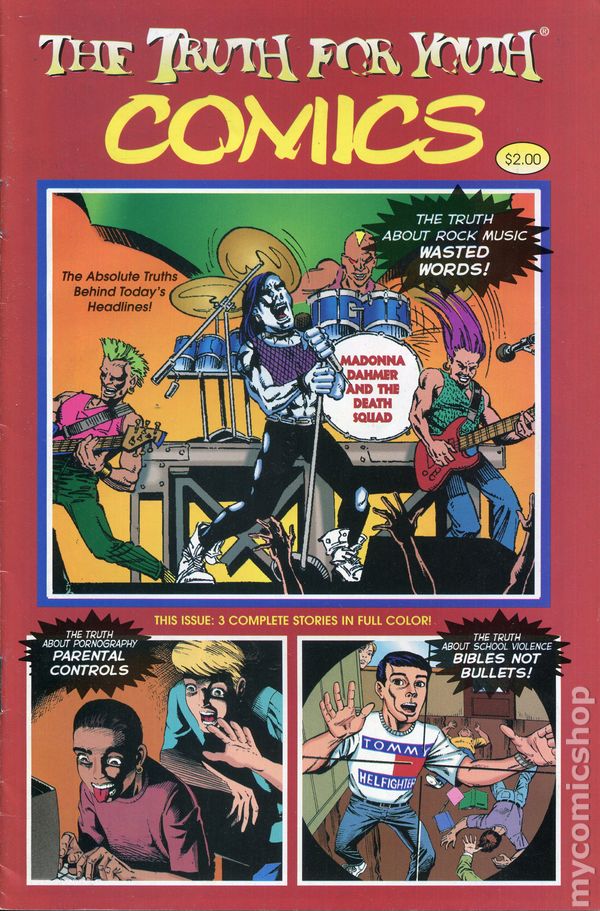 Christian propaganda comic distributed by Tim Todd Ministries. Features 3 stories: "The Truth about Rock Music: Wasted Words!", "The Truth about Pornography: Parental Controls", and "The Truth about School Violence: Bibles Not Bullets". 20 pages, full color. Cover price $2.00.