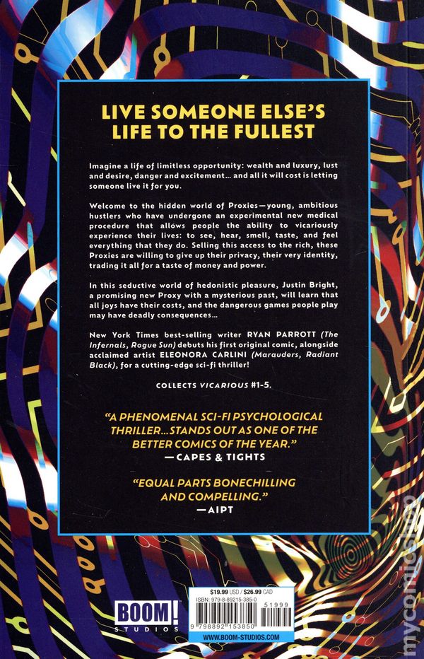 1st printing. Collects Vicarious (2024 Boom) #1-5. Written by Ryan Parrott. Art by Eleonora Carlini. Cover by Dan Panosian. In this near-future sci-fi thriller, young, ambitious people called "Proxies" have undergone an experimental surgery that allows others the ability to vicariously experience their lives: to see, hear, smell, taste, and feel everything that they do. LIVE (SOMEONE ELSE'S) LIFE TO THE FULLEST. Imagine a life of limitless opportunity: wealth and luxury, lust and desire, danger and excitement... and all it will cost is letting someone live it for you. Welcome to the hidden world of Proxies–young, ambitious hustlers who have undergone an experimental new medical procedure that allows people the ability to vicariously experience their lives: to see, hear, smell, taste, and feel everything that they do. Selling this access to the rich, these Proxies are willing to give up their privacy, their very identity, trading it all for a taste of money and power. In this seductive world of hedonistic pleasure, Justin Bright, a promising new Proxy with a mysterious past, will learn that all joys have their costs, and the dangerous games people play may have deadly consequences... New York Times best-selling writer Ryan Parrott (The Infernals, Rogue Sun) debuts his first original comic, alongside acclaimed artist Eleonora Carlini (Marauders, Radiant Black), for a cutting-edge sci-fi thriller! Softcover, 144 pages, full color. Rated T+ Cover price $19.99.