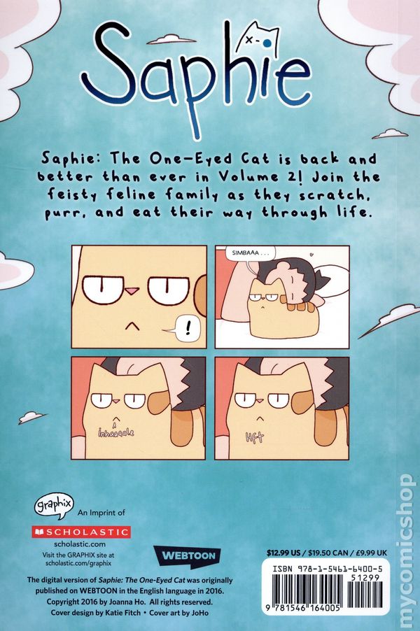Volume 2 - 1st printing. Story and art by OHO. The hilarious hit Webtoon is now a graphic novel! In Volume Two, join Saphie and her fellow house cats as they zoom, scratch, and nap their way through life. It's purr-fect for fans of Pusheen! What exactly does a one-eyed cat do all day? Well, there's running, knocking things over, scratching things you're not supposed to, terrorizing your brothers, messing with your owner, stealing food, and generally causing mayhem left, right, and center! Saphie the One-Eyed Cat Volume 2 features more delightful adventures with our favorite feisty feline and her family. Softcover, 6-in. x 9-in., 128 pages, full color. All Ages Cover price $12.99.