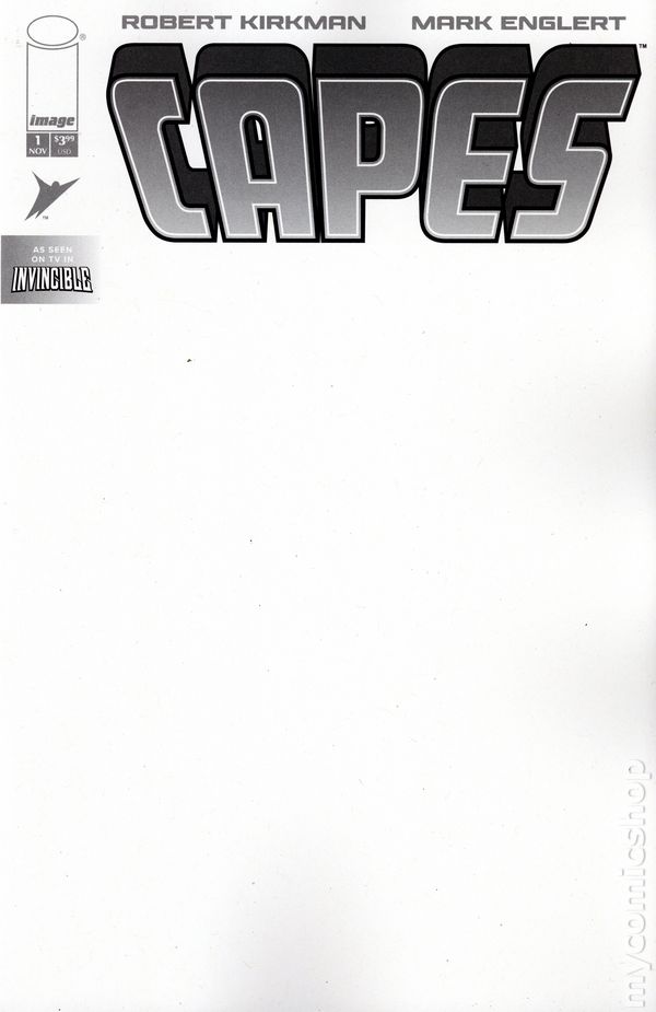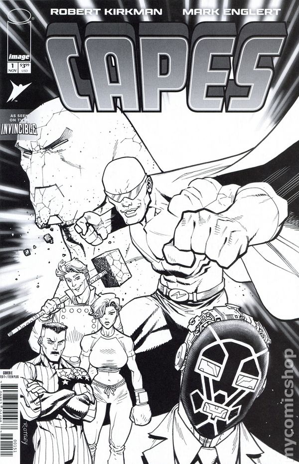 Limited 1 for 50 Retailer Incentive Variant Cover.(W) Robert Kirkman (A) Mark Englert (CA) Ryan Ottley NEW SERIES LONG OUT-OF-PRINT AND VERY IN-DEMAND! RE-INTRODUCING ROBERT KIRKMAN AND MARK ENGLERTS CORNER OF THE INVINCIBLE UNIVERSE! A special remastering of CAPES, featuring new art and dialogue! BOLT! KID THOR! KNOCK OUT! CAPTAIN COSMIC! CLAIRE VOYANT! BIG BRAIN! COMMANDER CAPITALISM! Welcome to Capes Inc, employers of your favorite super heroes that protect—well, at least when theyre on the clock—New York City from threats like MACHINE HEAD, TITAN...and now are in the crosshairs of an enemy they never expected! 32 pages, full color, rated teen+. Cover price $3.99.