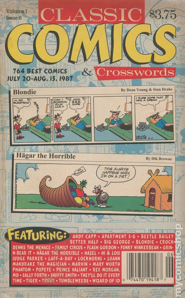 June 22 - July 18, 1987. $3.75 Cover price. This Monthly series collects comic strips with crossword puzzles. Featuring many King Feature comic strips including Andy Capp, Apartment 3-G, Beetle Bailey, Better Half, Big George, Blondie, Crock, Dennis the Menace, Family Circus, Flash Gordon, Funky Winterbean, Grin and Bear It, Hägar the Horrible, Hazel, Hi & Lois, Judge Parker, Lockhorns, Luann, Marvin, Mandrake the Magician, Mary Worth, Popeye, Phantom, Prince Valiant (Sunday), Rex Morgan, Sally Forth, Snuffy Smith, They'll Do It Every Time, Tiger, Trudy, Tumbleweeds, and Wizard of Id. 132 pages, B&W. Cover price $3.75.
