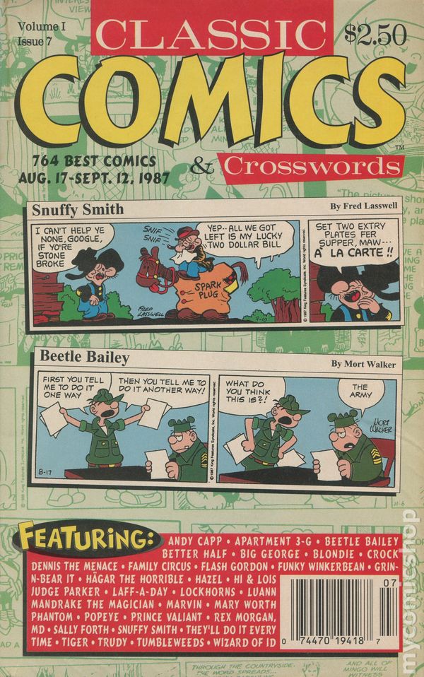 July 20 - August 15, 1987. $3.75 Cover price. This Monthly series collects comic strips with crossword puzzles. Featuring many King Feature comic strips including Andy Capp, Apartment 3-G, Beetle Bailey, Better Half, Big George, Blondie, Crock, Dennis the Menace, Family Circus, Flash Gordon, Funky Winterbean, Grin and Bear It, Hägar the Horrible, Hazel, Hi & Lois, Judge Parker, Lockhorns, Luann, Marvin, Mandrake the Magician, Mary Worth, Popeye, Phantom, Prince Valiant (Sunday), Rex Morgan, Sally Forth, Snuffy Smith, They'll Do It Every Time, Tiger, Trudy, Tumbleweeds, and Wizard of Id. 132 pages, B&W. Cover price $3.75.