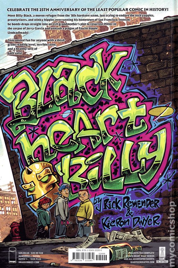 1st printing. Written by Rick Remender. Art by Kieron Dwyer and Harper Jaten. Cover by Kieron Dwyer. After decades in comic-book exile, the absurd skatepunk cult classic BLACK HEART BILLY returns, celebrating 25 gloriously questionable years of terrible choices, filthy living, and a long-forgotten punk-rock ideology all wrapped up in the last thing it deserves, a fancy hardcover. Meet Billy Black: skate-punk misfit with a robotic head, a bottomless supply of sarcastic contempt for society, and terrible impulse control. His life is a never-ending quest for fun, punk rock debauchery, and skating abandoned pools-- until a deranged Nazi scientist decides to bring Adolf Hitler back inside the reanimated corpse of Jerry Garcia. Now, San Francisco is rapidly descending into a fascist hippie nightmare and only Billy, armed with snide disdain, a baseball bat, and reckless disregard for personal safety, can defeat this self-righteous, patchouli soaked, moral authority. Created by the dynamic duo of RICK REMENDER (GROMMETS, THE SCUMBAG) and KIERON DWYER (SEA OF RED, Captain America), BLACK HEART BILLY is a joyful mash-up of comic absurdity, irreverent satire, and non-stop anarchic action. This stylish hardcover collects the entire original run in original black & white, plus a treasure trove of previously unseen goodies and a new afterword that Remender probably wrote in a nostalgic delirium. Softcover, 120 pages, full color. Cover price $29.99.