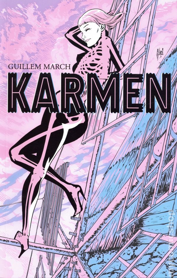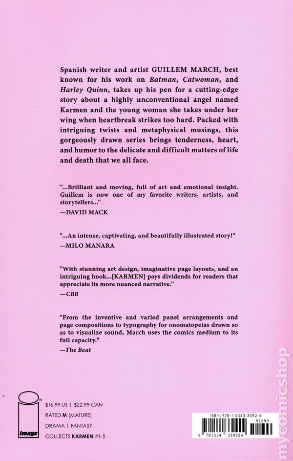 1st printing. Collects Karmen (2021 Image) #1-5. Story and art by Guillem March. NEW YORK PUBLIC LIBRARY BEST NEW COMICS OF 2022. Bold, intimate, and deeply human—this original graphic novel challenges what we think we know about life, death, and everything in between. Spanish writer and artist GUILLEM MARCH is best known for his ongoing, extensive work with DC Comics on _Batman, Catwoman, _and Harley Quinn and has worked as an artist on several graphic novels including the English editions of Monika with Titan Comics and The Dream with Europe Comics. Here, he takes up his pen for an edgy new volume about a highly unconventional angel named Karmen and the young woman she takes under her wing when a case of heartbreak strikes hard. Packed with surprises and metaphysics, this gorgeously drawn series deploys tenderness and humor as it dives deep into topics that matter. Softcover, 120 pages, full color. Mature Readers Cover price $16.99.