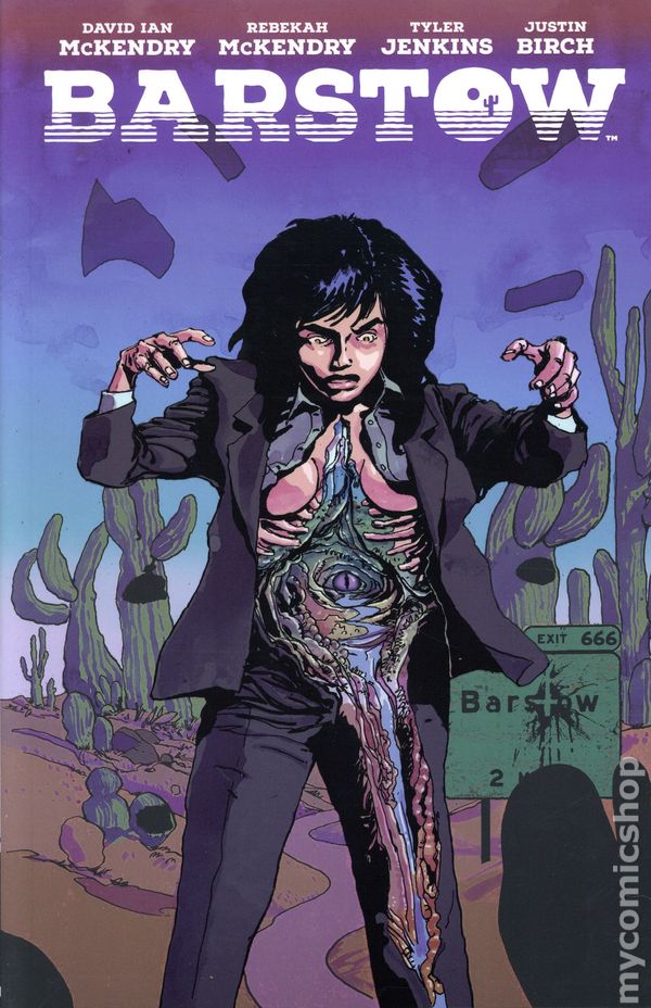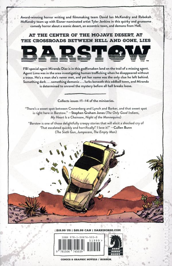 1st printing. Collects Barstow (2024 Dark Horse) #1-4. Written by David Ian McKendry and Rebekah McKendry. Art and cover by Tyler Jenkins. At the center of the Mojave Desert, at the crossroads between hell and gone, lies Barstow. FBI Special Agent Miranda Diaz is in this godforsaken land on the trail of a missing agent. Agent Lima was in the area investigating human trafficking when he disappeared without a trace. He's a man she's never met, and yet her name was the only clue he left behind. Something dark... something demonic... lurks beneath this oddball town and Miranda is determined to unravel the mystery before all hell breaks loose. Softcover, 144 pages, full color. Cover price $19.99.