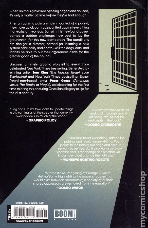 1st printing. Collects Animal Pound (2023 Boom) #1-5. Written by Tom King. Art and Cover by Peter Gross. An Orwellian masterpiece for the modern age, an Animal Farm for the 21st century, by legendary comics scribe Tom King and Eisner Award-nominated artist Peter Gross, collaborating for the first time ever. When animals grow tired of being caged and abused, its only a matter of time before they have nothing to lose but their cages... When an uprising puts a pound in control of the animals, they make quick comrades, united against everything that walks on two legs. But with this newfound power comes a sudden challenge: how best to lay the groundwork for this new democracy as they write their first constitution. The conditions are ripe for a dictator, primed for instating a new system of brutality and death. When two groups of animals work together will their efforts be enough to prevent further animal authoritarianism? Discover a timely graphic storytelling event from celebrated New York Times bestselling, Eisner Award-winning writer Tom King (The Human Target, Love Everlasting) and New York Times bestselling, Eisner Award-nominated artist Peter Gross (American Jesus, The Books of Magic), collaborating for the first time ever to bring this enduring Orwellian allegory to life for the 21st Century. Softcover, 176 pages, full color. Rated T+ Cover price $19.99.
