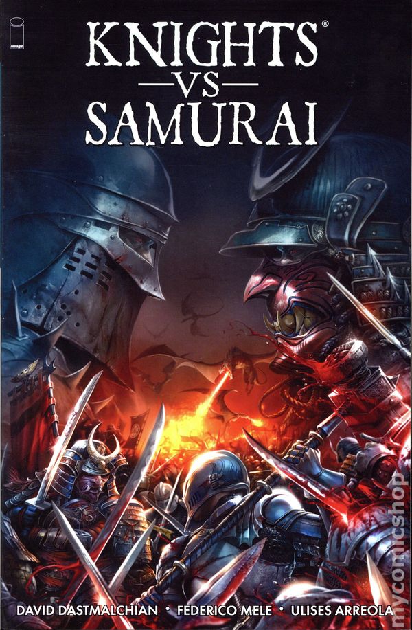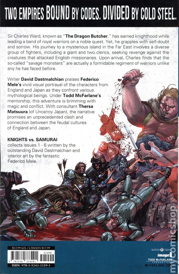 Volume 1 - 1st printing. Collects Knights vs. Samurai (2024 Image) #1-6. Written by David Dastmalchian. Art by Fede Mele. Cover by Francesco Mattina. Back Cover by Fede Mele. Japanes Translation by Thersa Matsuura. Writer DAVID DASTMALCHIAN praises FEDERICO MELE for vividly portraying characters from England and Japan as they face various mythological beings. Under TODD MCFARLANE's direction, this adventure blends magic, combat, and the pursuit of truth, with insights from consultant **THERSA MATSUURA **(of Uncanny Japan), showcasing a unique clash and connection between feudal England and feudal Japan. Softcover, 144 pages, full color. Teen+ Cover price $12.99.