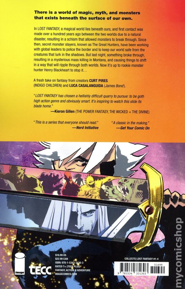 Volume 1 - 1st printing. "A World Beneath!" Collects Lost Fantasy (2025 Image) #1-4. Written by Curt Pires. Art and cover by Luca Casalanguida. There is a world of magic, myth, and monsters that exists beneath the surface of our own. In Lost Fantasy, a magical world lies beneath ours, and first contact was made over a hundred years ago between the two worlds due to a natural disaster, resulting in a schism that allowed monsters to break through. Since then, secret monster slayers, known as The Great Hunters, have been working with global leaders to police the border and to keep our world safe from the creatures that lurk in the shadows. But last night, something broke through, resulting in a mysterious mass killing in Montana, and causing things to shift in a way that will ripple through both worlds. Now its up to rookie monster hunter Henry Blackheart to stop it… Softcover, 144 pages, full color. Teen+ Cover price $16.99.