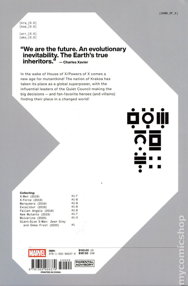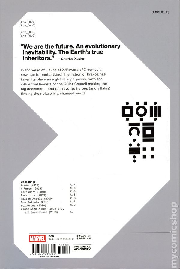 Volume 1 - 1st printing. Collects X-Men (2019-2021 Marvel) #1-7,X-Force (2019 5th Series) #1-8, Marauders (2019-2022 Marvel) #1-8, Excalibur (2019-2022 Marvel) #1-8, Fallen Angels (2019 Marvel) #1-6, New Mutants (2020-2023 Marvel) #1-7, Wolverine (2020-2024 6th Series) #2-3, Giant Size X-Men: Jean Grey and Emma Frost (2020 Marvel) and material from Wolverine (2020-2024 6th Series) #1. Written by Jonathan Hickman, Gerry Duggan, Tini Howard, Ed Brisson, Benjamin Percy, Bryan Hill, and Russell Dauterman. Art by Leinil Francis Yu, Gerry Alanguilan, R. B. Silva, Matteo Buffagni, Matteo Lolli, Lucas Werneck, Mario Del Pennino, Michele Bandini, Elisabetta D'Amico, Stefano Caselli, Marcus To, Wilton Santos, Oren Junior, Sean Parsons, Roberto Poggi, Victor Nava, Rod Reis, Flaviano, Marco Failla, Joshua Cassara, Stephen Segovia, Jan Bazaldua, Szymon Kudranski, Adam Kubert, and Russell Dauterman. Cover by Russell Dauterman. In the wake of HOUSE OF X/POWERS OF X comes a new age for mutantkind! The mutant nation of Krakoa has taken its place as a new global superpower, with the influential leaders of the Quiet Council making the big decisions - and fan-favorite heroes (and villains) finding their place in the new world! Cyclops, Jean Grey and their extended clan make a Summer House for themselves - on the moon! Wolverine finally has everything he ever wanted - but that means he has everything to lose! The reunited New Mutants head out on a cosmic quest to find a missing friend! A dangerous crew of mutants are recruited for X-Force - one half intelligence, the other half special ops! Meanwhile, Captain Kate Pryde sets sail on the high seas with her crew of Marauders, searching for mutants in need! A new Captain Britain leads Excalibur, and one of their number is... Apocalypse?! But who are the Fallen Angels? Hardcover, 8 1/2-in. x 11-in., 1,400 pages, full color. Parental Advisory Cover price $150.00.