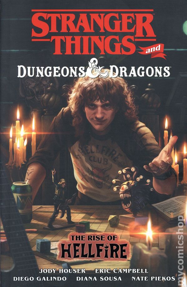 1st printing. Collects Stranger Things and Dungeons and Dragons: The Rise of Hellfire (2025 Dark Horse) #1-4. Written by Jody Houser and Eric Campbell. Art by Diego Galindo. Cover by Magali Villanueve. Back Cover by Diego Galindo. Lucas, Dustin, and Mike embark on a high-fantasy adventure with classmate Eddie Munson and his Hellfire Club in this new four-issue mini-series, collected here as a graphic novel! Spell slinging, sword swinging, and the luck of the dice have shaped the lives of the Stranger Things boys well before they had real monsters to face. This D&D crossover delves into Eddie Munson's past and his rise to de facto leader of the Hellfire Club, and explores his recruitment of Lucas, Dustin, and Mike. Throughout, there are brilliant glimpses into the fantasy world of Dungeons & Dragons that they explore together. This book highlights what really makes tabletop RPGs great through the lens of the hit Netflix series. At first, the Mirkwood gang is hesitant to join a new campaign without Will and El, but Eddie conjures up his charm and does his best to inspire them to answer his call to adventure. Reflecting on the legendary campaign that got him hooked, Eddie remembers how the original Hellfire crew navigated the weird social dynamics of Hawkins High, seeking new party members to help take on a vicious manticore that nearly wiped out their party, proving time and time again that the party is always stronger than the individual adventurer. Rumors about Eddie's bad reputation make Lucas worry that joining his club might hurt his chances of making the basketball team. But when the dice are cruel, Eddie's true character shines through, earning all of the boys' respect. Eddie Munson ushers in a new age for Hawkins High Hellfire Club with an exciting conclusion to Mike, Dustin, and Will's first big Hellfire Club victory. An action-packed fantasy love letter to the nerds of the eighties who dared to roll dice before it was cool, written by Jody Houser (Critical Role, Doctor Who) and Eric Campbell (Frank Frazetta's Dawn Attack), and expertly drawn by Diego Galindo (Stranger Things: Tomb of Ybwen). Softcover, 104 pages, full color. Cover price $19.99.