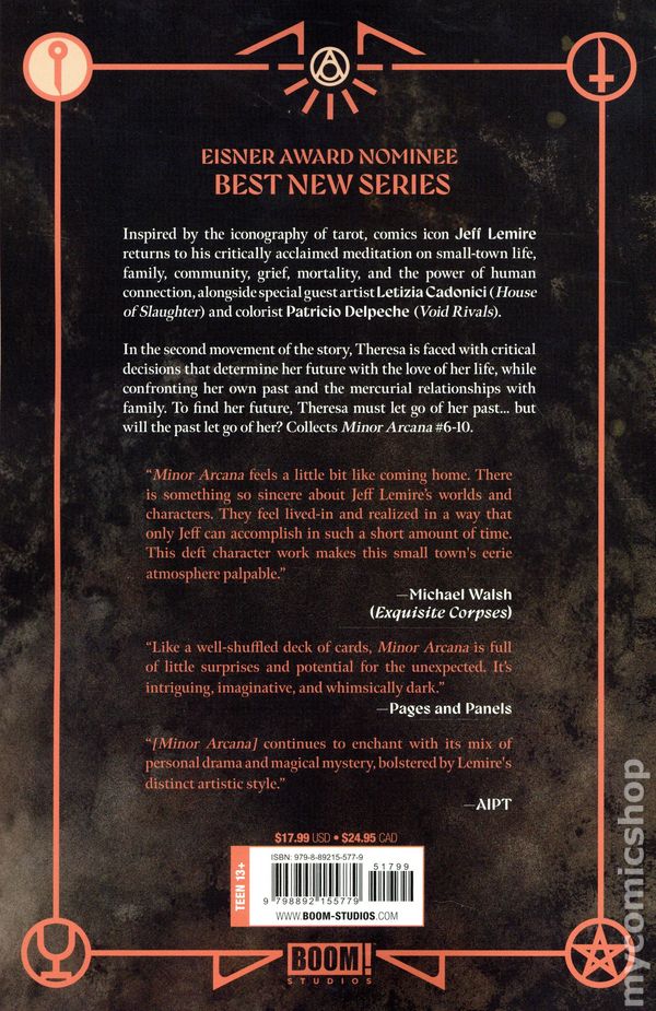 Volume 2 - 1st printing. Collects Minor Arcana (2024 Boom) #6-10. Story and art by Jeff Lemire. Comics legend Jeff Lemire continues his modern masterpiece with the next chapter of Minor Arcana, an ambitious, emotional story of magical realism inspired by tarot. Inspired by the iconography of tarot, comics icon Jeff Lemire returns to his critically acclaimed meditation on small town life, family, community, grief, mortality, and the power of human connection. In the second movement of the story, collected here for the very first time, Theresa is faced with critical decisions that determine her future with the love of her life, while confronting her own past and the mercurial relationships with family. To find her future, Theresa must let go of her past... but will the past let go of her? Softcover, 144 pages, full color. Rated T+ Cover price $17.99.