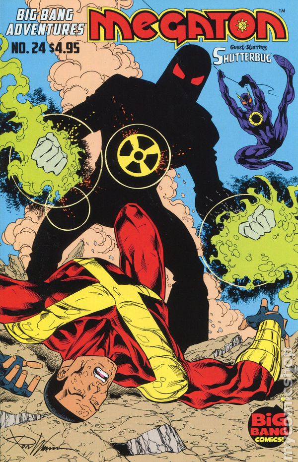 Story by Ray Mackay, Gary Carlson, and Charlie Boatner. Art by Ron Williams and Paul Bonnano. Cover by Ron Williams. Chaos rocks a charity carnival and brings Megaton face to face with a deadly new supervillain! But who is this mysterious Agent Orange and what does he want? And will the combined might of Megaton and Shutterbug be enough to stand up to his dangerous powers? Find out this and more in Big Bang Comics exciting 24th issue featuring Megaton in Chemical Warfare!! Plus, Astra the Rocket Girl is attacked by an alien Cog-Roach who wants her spaceship to escape a black hole. Full Color. 36 pages. Cover price $4.95.