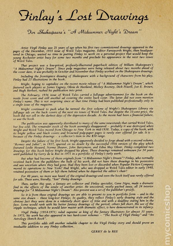 Collection of 24 black and white plates illustrated by Virgil Finlay for Shakespeare's "A Midsummer Night's Dream". Limited to 1000 unnumbered copies. Contents laid into an illustrated folder. 8.5" x 11", 24 pages, B&W.