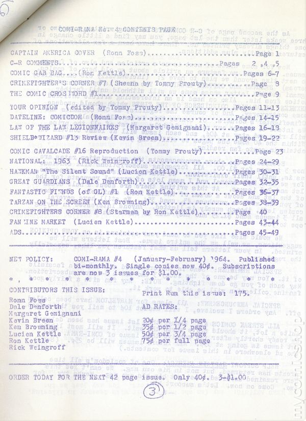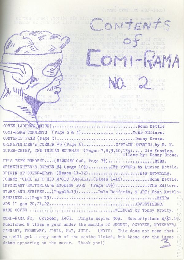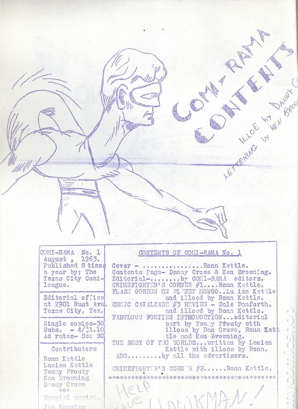Comic fanzine published by Ron and Lucien Kettle. 8.5" x 11", 50 pages, mimeo. Cover price $0.30.