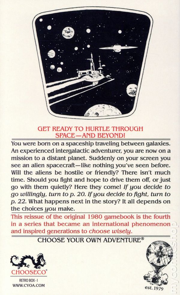 1st printing. Written by R.A. Montgomery. Art and cover by Paul Granger. Get ready to hurtle through space – and beyond! You were born on a spaceship traveling between galaxies. An experienced intergalactic adventurer, you are now on a mission to a distant planet. Suddenly, on your screen you see an alien spacecraft – like nothing youve seen before. Will the aliens be hostile or friendly? There isnt much time. Should you fight and hope to drive them off, or just go with them quietly? Here they come! What happens next in the story? It all depends on the choices YOU make. This reissue of the original 1979 gamebook is the fourth in a series that became an international phenomenon and inspired generations to CHOOSE wisely This reissue of the original 1979 gamebook is the third in a series that became an international phenomenon and inspired generations to CHOOSE wisely Softcover, 4 1/4-in. x 7-in., 136 pages, Text (with B&W Illustrations). Ages 9-12 NOTE: This edition was originally only available with the Choose Your Own Adventure SC The Retro Box Set (2025 CYOA) Retro Editions