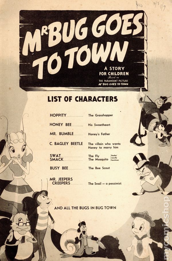 Australian edition of Mr. Bug Goes to Town. Based on the feature length film by Fleischer Studios. Hoppity the Grasshopper returns home to Buggsville, only to discover that its happy tranquility has been shattered when the populace learns of a colossal skyscraper to be built over their tiny town. 9.75" x 14.5", 32 pages, B&W illustrations.