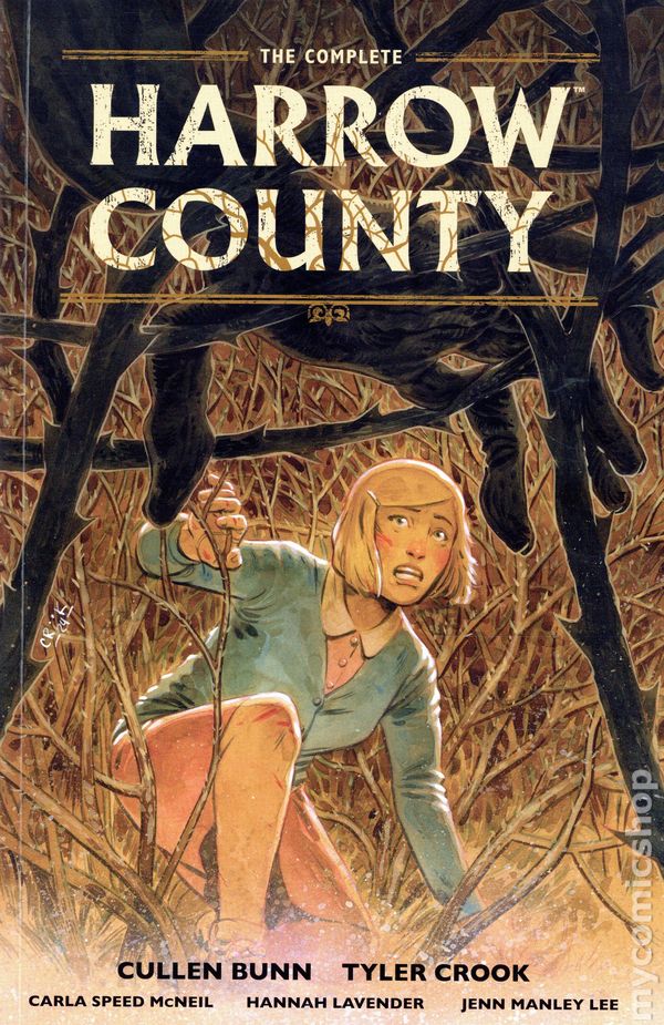 1st printing. Collects Harrow County (2015-2018) #1-32. Written by Cullen Bunn. Art by Tyler Crook, Carla Speed McNeil, Hannah Lavender, and Jenn Manley Lee. Cover by Tyler Crook. Dark Horse Comics proudly presents this complete collection of the entire comics run of the essential horror series Harrow County in a single, affordable trade paperback with a brand-new painted cover. Emmy always knew that the woods surrounding her home crawled with ghosts and monsters. But on the eve of her eighteenth birthday, she learns that she is connected to these creatures—and to the land itself—in a way she never imagined. Could Emmy be the reincarnation of an infamous witch? As supernatural forces that baffle the imagination align against her, Emmy must decide whether she will embrace or deny her destiny...with the fate of every soul—living or otherwise—hanging in the balance! This volume collects the entirety of HARROW COUNTY, the dark southern gothic fairy tale by Cullen Bunn and Tyler Crook, along with all extras from every library edition! Softcover, 1,080 pages, full color. Cover price $59.99.