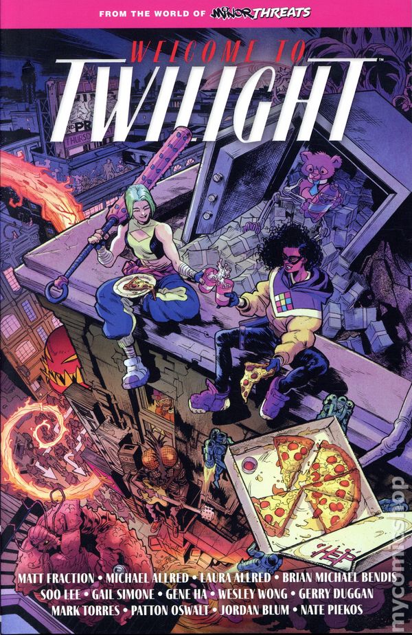 1st printing. Collects From the World of Minor Threats: Welcome to Twilight (2025 Dark Horse) #1-4. Written by Patton Oswalt, Matt Fraction, Brian Michael Bendis, Gail Simone, Gerry Duggan, and Jordan Blum. Art by Michael Allred, Soo Lee, Gene Ha, and Mark Torres. Cover and Chapter Breaks by Scott Hepburn. Spinning out of the world of the hit Minor Threats superhero series by Patton Oswalt, Jordan Blum, and Scott Hepburn comes a new collection of costumed underdogs—featuring stories by some of the leading creators in comic books. Twilight City may be home to the Minor Threats but they're not the only down-on-their-luck super villains and heroes struggling to find their way. Legendary creators Matt Fraction, Mike Allred, Brian Michael Bendis, Soo Lee, Gail Simone, Gene Ha, Gerry Duggan and Mark Torres explore the super-crime-infested streets of Twilight to tell twisted tales of secrets, revenge, love, murder, second chances, and crab people. Featuring original stories and characters for Minor Threats fans new and old. If you only read one graphic novel about homunculus-faced mobsters this year, make it this one! Softcover, 112 pages, full color. Rated T+ Cover price $19.99.
