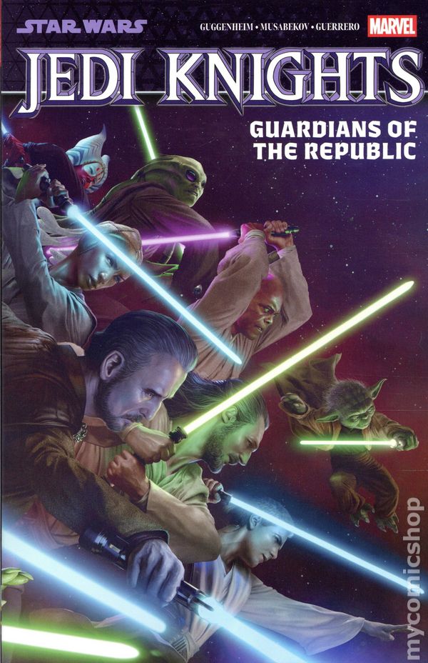 Volume 1 - 1st printing. "Guardians of the Republic!" Collects Star Wars: Jedi Knights (2025 Marvel) #1-5 and and material from Star Wars (2024 Marvel) FCBD #2025. Written by Marc Guggenheim. Art by Madibek Musabekov. Cover by Rahzzah. The guardians of peace and justice in the galaxy, the Jedi Knights, star in these new stories featuring characters both familiar and new! New adventures of the guardians of peace and justice in the galaxy: the Jedi Knights! Featuring iconic Jedi like Qui-Gon Jinn, Obi-Wan Kenobi, Yoda and Mace Windu alongside never-before-seen Jedi sure to become fan favorites! But who is the mysterious new villain targeting Qui-Gon Jinn? Softcover, 136 pages, full color. Rated T Cover price $17.99.