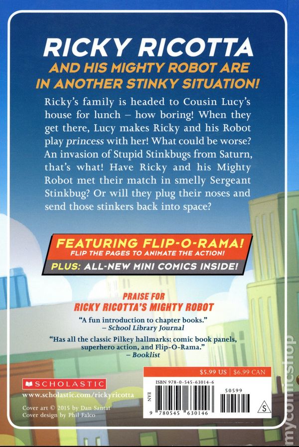 Volume 6 - 1st printing. "Ricky Ricotta's Mighty Robot vs. the Stupid Stinkbugs from Saturn!" Written by Dav Pilkey. Art and cover by Dan Santat. Ricky Ricotta and his Mighty Robot are in another stinky situation! Ricky's family is headed to Cousin Lucy's house for lunch -- how boring! Ricky and his Robot are hoping to have a little fun with Lucy's pet Jurassic Jackrabbits, but when they get there, Lucy makes them play princess with her instead! What could be worse? An invasion of Stupid Stinkbugs from Saturn, that's what! Smelly Sergeant Stinkbug has arrived on Earth with a plan to kidnap its ruler, and Princess Lucy fits the bill. Now it's up to Ricky and his Mighty Robot to plug their noses and send those stinkers back into space! Softcover, 5 1/2-in. x 7 1/2-in., 128 pages, full color. All Ages Cover price $5.99.