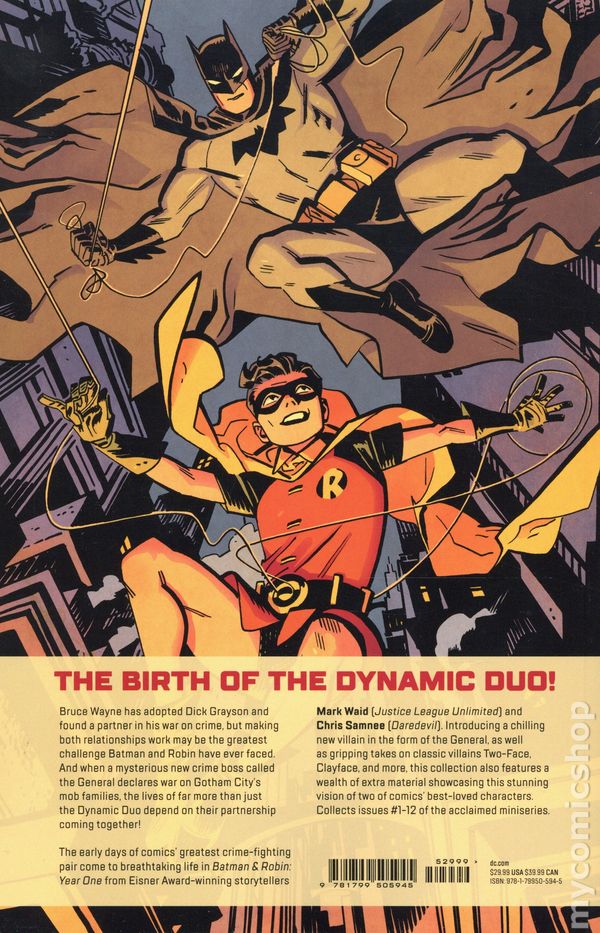 1st printing. Collects Batman and Robin: Year One (2024 DC) #1-12. Written by Mark Waid and Chris Samnee. Art and cover by Chris Samnee. SUPERSTAR CREATORS MARK WAID AND CHRIS SAMNEE TELL THE DEFINITIVE ORIGIN OF THE DYNAMIC DUO! The early days of comics greatest crime-fighting duo come to life in this stunning collection, courtesy of two of modern comics greatest storytellers: Eisner Award winners Mark Waid (Justice League Unlimited) and Chris Samnee (Daredevil). While Bruce Wayne and orphan Dick Grayson struggle with the challenges of becoming father and son and partners, a mysterious new crime boss called the General declares war on Gotham's mob families. But what is his connection to Two-Face? Batman and his new sidekick, Robin, are out for answers, but it'll take everything they have to navigate both sides of their relationship, with Dick Grayson's present and future hanging in the balance! Softcover, 336 pages, full color. Teen Cover price $29.99.